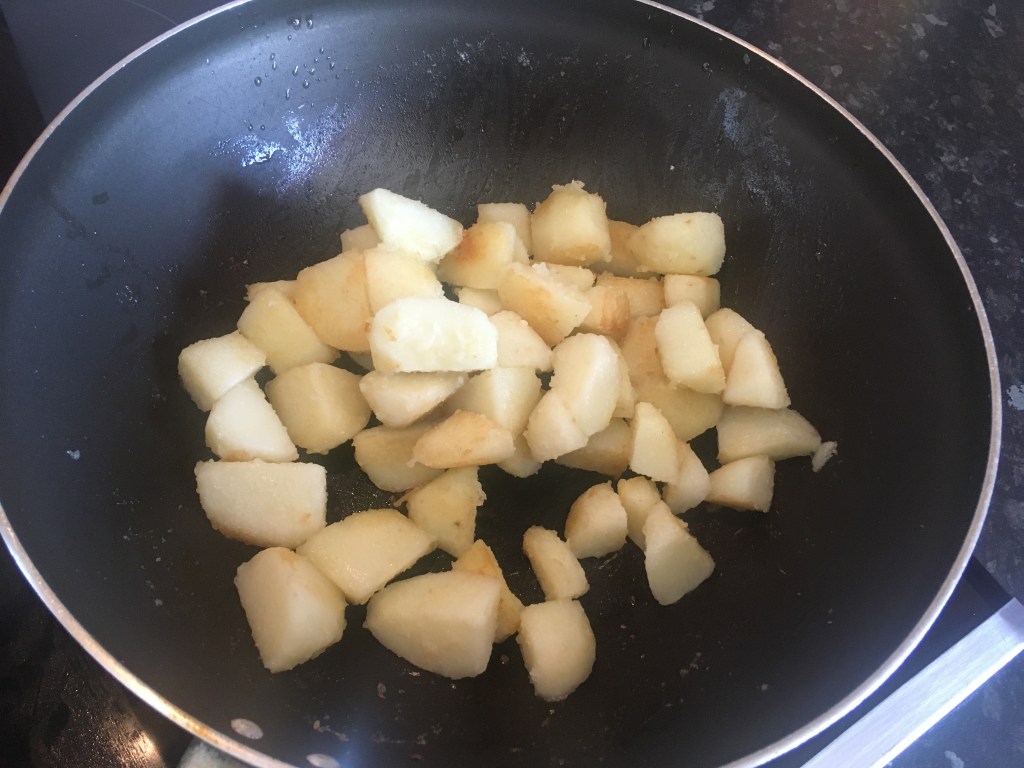 In a wok, heat some oil and pan fry the potato chunks. While the potatoes are sauteing in the pan. Keep an eye on the potatoes as they cook, making sure they don’t stick to the pan.