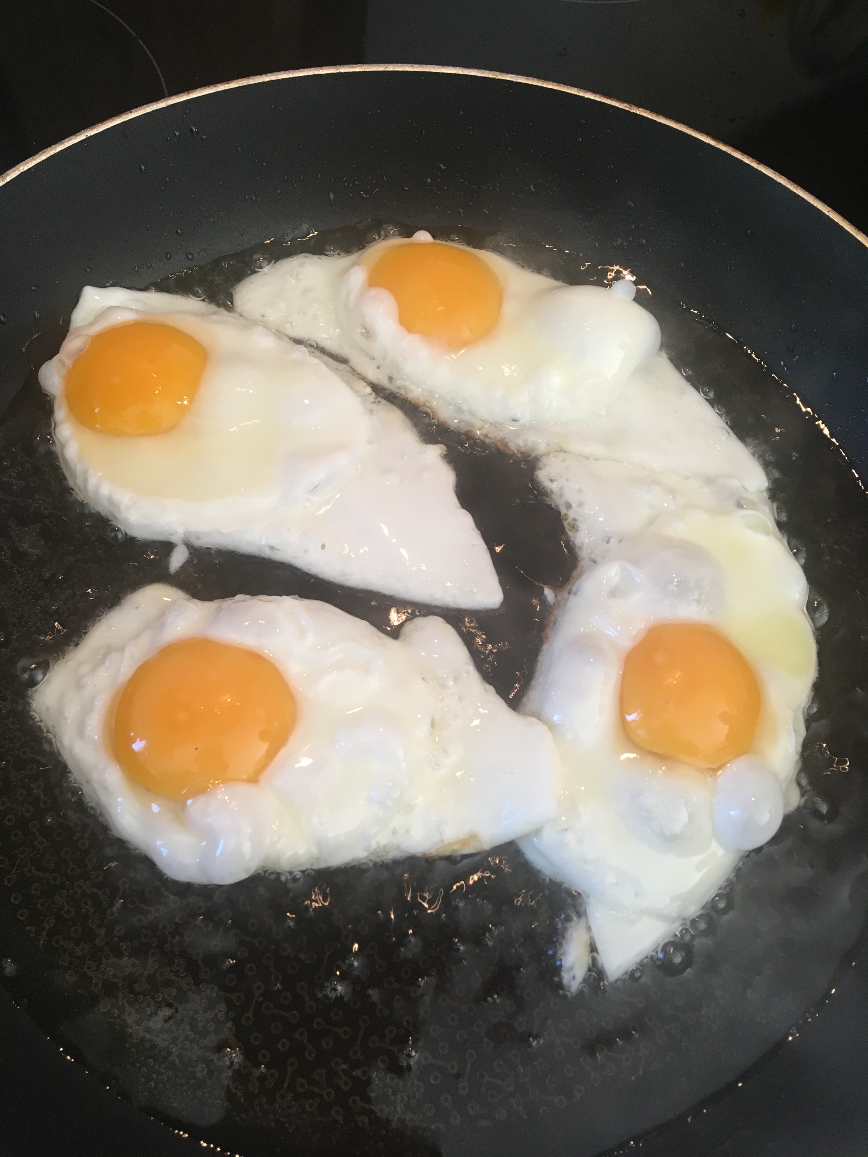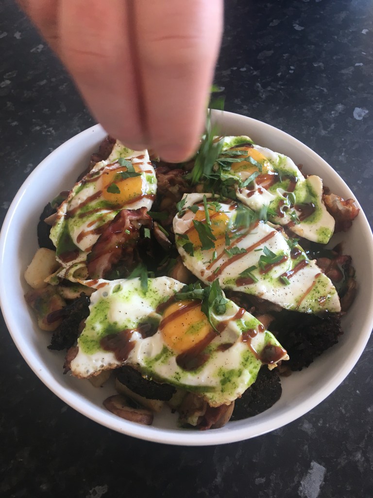 This brunch dish can be tweaked by adding or subtracting any ingredient. It’s so simple and quick to prepare. Either grill or fry, whichever you prefer. Make some parsley oil with half the parsley and some olive oil and finally chopped parsley. A crisp edge on the eggs and runny yolks are a must. That is a perfect fried egg to me, not a teased with a the frying pan egg.