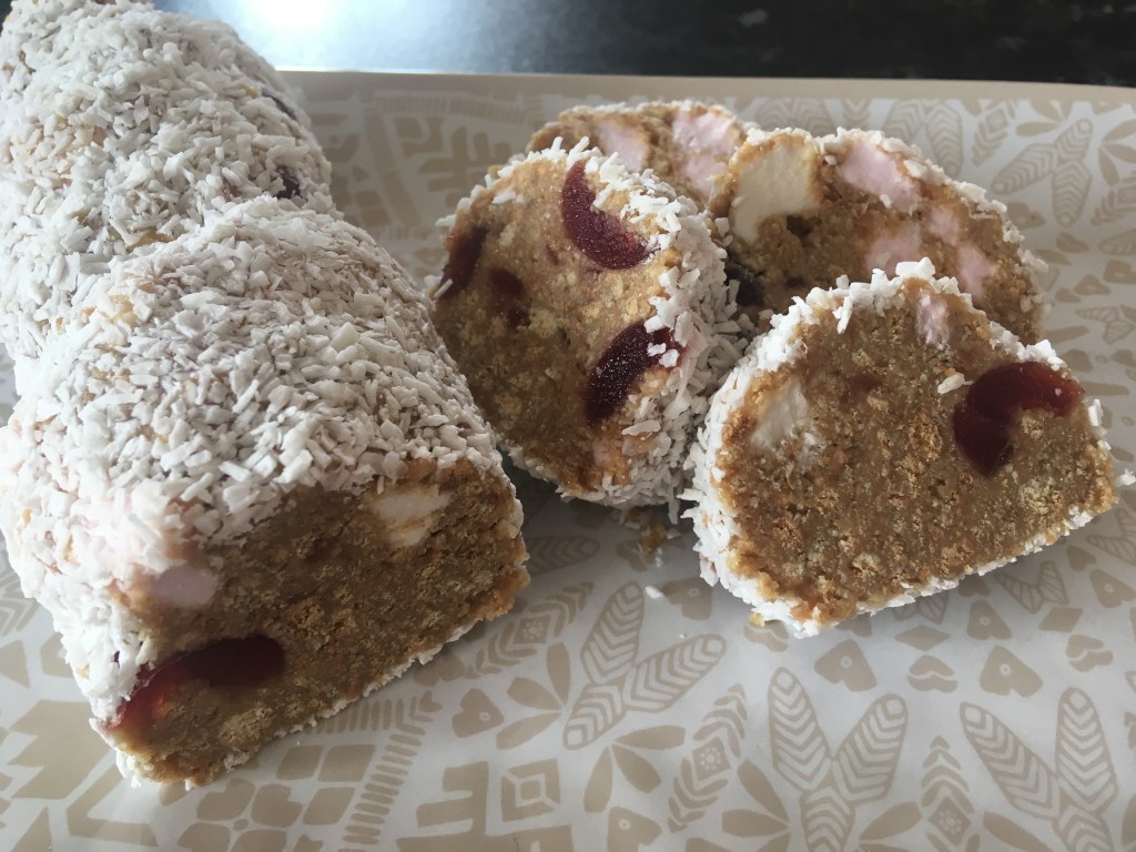 Dust some coconut over a large sheet of grease-proof paper. Pour the mixture onto the paper and roll the grease-proof paper and mould into a sausage shape, twisting the ends. Refrigerate for a few hours or pop in the freezer. Once set, slice and serve.