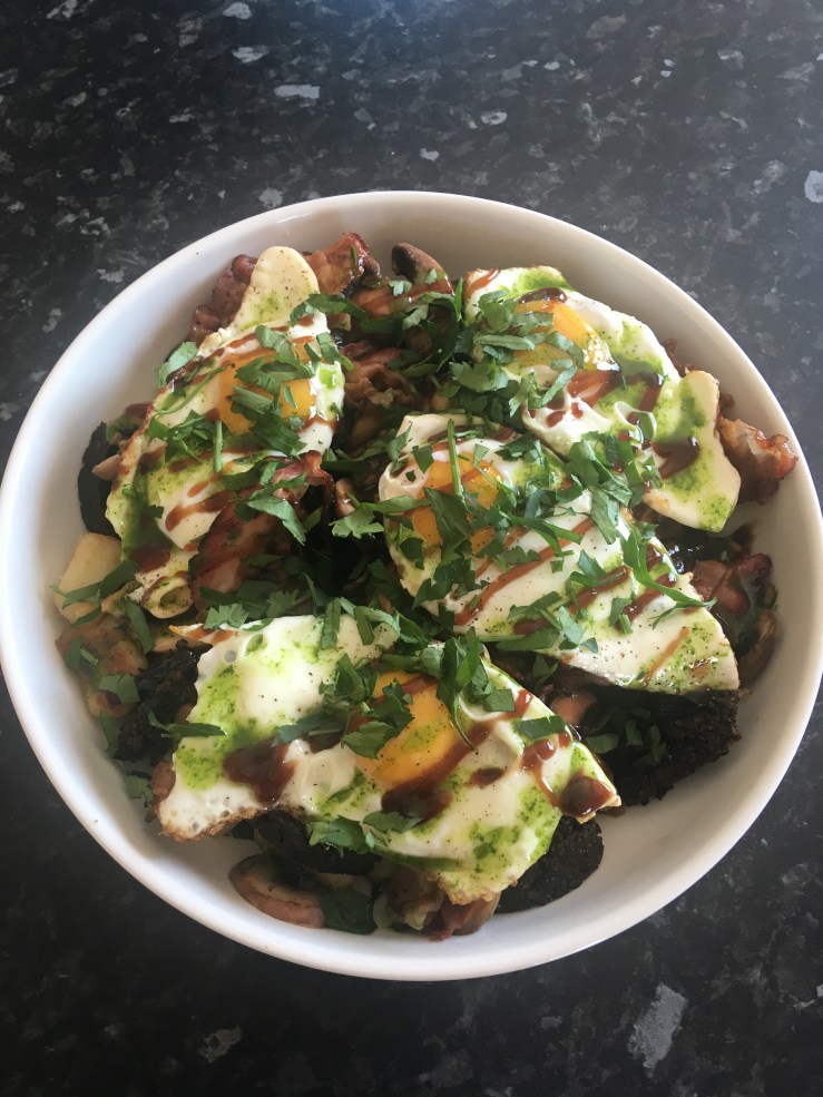 - Now it’s time to assemble our dish. Remove all ingredients from the grill and chop the black pudding into chunks. Using a large serving dish, layer the potato chunks, mushrooms, crispy bacon and black pudding chunks in the dish. Top with the fried eggs and drizzle some balsamic syrup, parsley oil and remaining chopped parsley.